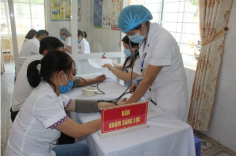 Trước khi tiêm vắc xin phòng COVID-19, nhân viên y tế được tư vấn, khám sàng lọc sức khoẻ