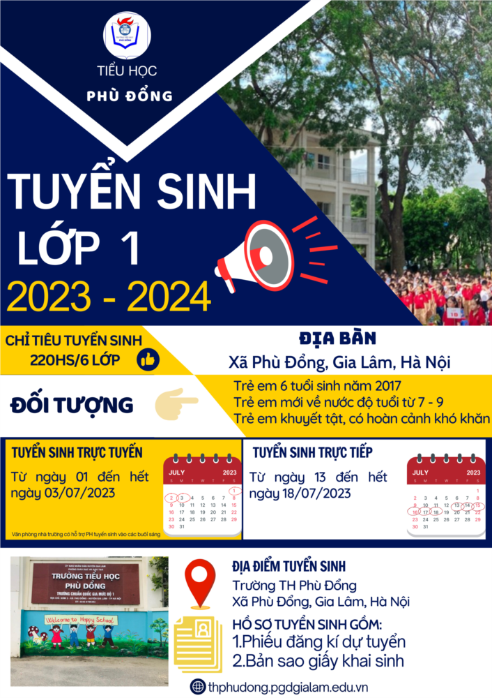 Thời gian tuyển sinh trực tiếp từ ngày 13-18/07/2023, cha mẹ thực hiện tuyển sinh trực tiếp và nộp hồ sơ tuyển sinh cho con (với học sinh đã tuyển sinh trực tuyến thành công) tại trường Tiểu học Phù Đổng.