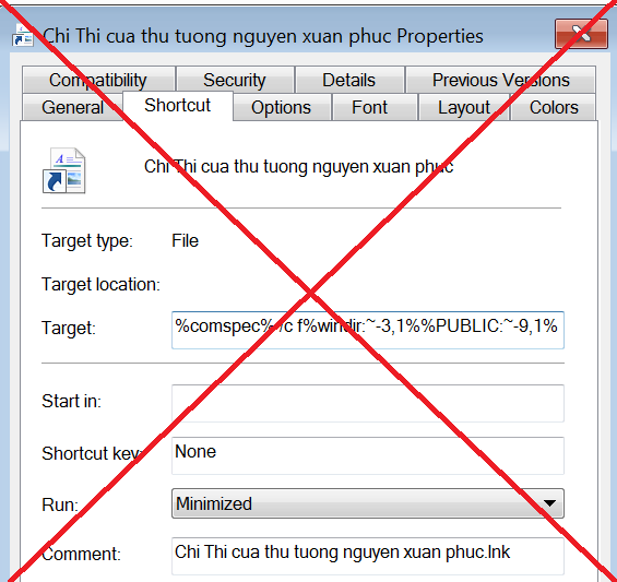 Tập tin có dạng shortcut với phần mở rộng là “.lnk” được ngụy trang dưới biểu tượng tập tin văn bản nhằm đánh lừa người dùng. Nếu người dùng tải tập tin đính kèm về và mở trên máy tính (mã độc này chỉ hoạt động trên hệ điều hành Windows), mã độc sẽ được kích hoạt, cài đặt vào máy tính, kết nối đến máy chủ điều khiển để tải các đoạn mã độc khác và nhận lệnh điều khiển của tin tặc, đồng thời, mở tập tin văn bản để đánh lừa người dùng. Khi đó, tin tặc có thể thực hiện nhiều lệnh thực thi khác nhau, như đánh cắp dữ liệu, thông tin máy tính, sử dụng để tiếp tục phát tán sang máy tính khác...